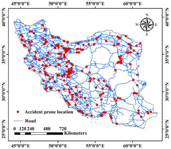 By applying the KDE on accident-risk maps, the most significant accident-prone locations were identified. Accordingly, we first merged the accident-risk maps to obtain the mean accident risk at each road point. Then we applied the KDE and classified the results into two classes with the natural junks method. Overall, 237 points were identified in the study area, as shown in Figure 9. These points must be given priority in taking the necessary steps.