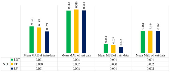 Comparing the machine learning algorithms in modeling, we see that ensemble methods usually perform more precisely than a single algorithm. The main idea of ensemble learning is to weigh multiple single estimators and merge them to enhance predictive performance [37]. Ensemble learning algorithms, such as bagged decision trees (BDT), extra trees (ET), and random forest (RF), are a series of decision trees. The benefits of decision tree and ensemble learning make BDT, ET, and RF algorithms easy to understand and precise [38]. However, each of these ensemble algorithms has a different structure that improves its performance; for example, BDT helps reduce variance and error in big data, RF contains a large number of independent trees [39], and ET provides fast accurate predictions [40].