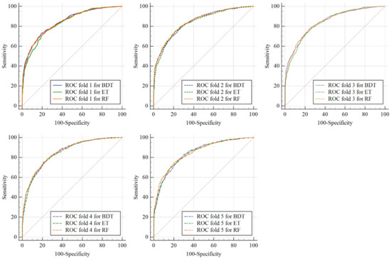 The y-axis of the ROC curve represents sensitivity, whereas the x-axis represents specificity. The contrast between the sensitivity and specificity in several cutting points evaluates the model performance [10]. The sensitivity and specificity are probabilistic metrics in the range of [0, 1], computed using Equations (4) and (5), respectively. The probability of a correct prediction of positive and negative samples is measured by sensitivity, and specificity, respectively [90]. The area under the ROC curve is called AUC and detects the probability of a correct prediction of a random sample. AUC is in the range of [0, 1], and the higher AUC shows the better model performance [91].