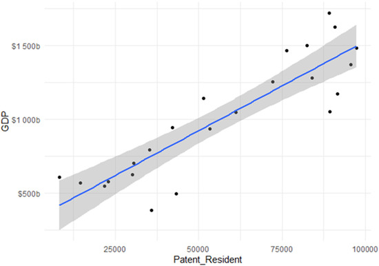 The influence of R&D expenditures on the yield of organizations on an institutional level has been analyzed and proven to exist in multiple research papers [18]. In this paper, the connection between the innovation factor R&D expenditures and Korea’s GDP was analyzed on a macroeconomic level and could not be proven to be statistically significant. This might be because monetary investments in other areas influencing the GDP, production, for instance, deliver faster returns of investment. Thus, a significant direct relationship between R&D and the dependent variable could not be identified through the time series data in this case. Another reason could be that other independent variables in the model were more closely connected to the GDP than R&D expenditures, and, therefore, that factor was not rated to be significant due to the composition of variables in this model. The amount and the composition of the variables used influence the outcome of the regression analysis. In linear, single regression, using R&D expenditures exclusively as the independent variable and the GDP as the dependent variable, for instance, a statistically significant relationship in countries could be identified, for example, in the research of Akcali and Sismanoglu. Therefore, it cannot be claimed that a connection between R&D expenditures as an innovation factor and a country’s GDP does not exist, even though the model used in this paper does not support the previous research results [38].
