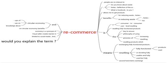 Each “competence” term, CE, re-commerce, and Facebook, was expressed and explained by the respondents in different synonymous terms to ensure the competences of the respondents towards those key concepts. CE considers the interrelated process of reducing, reusing, and recycling things. Some users said that it is the philosophy of reducing waste to zero to promote reusing products. CE was also termed by respondents as a cradle-to-cradle system, nurturing regenerative philosophy, a waste-less economy, zero-waste philosophy, waste reduction, the extension of product life, promotion of upcycling, and an environmental protection system.