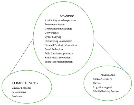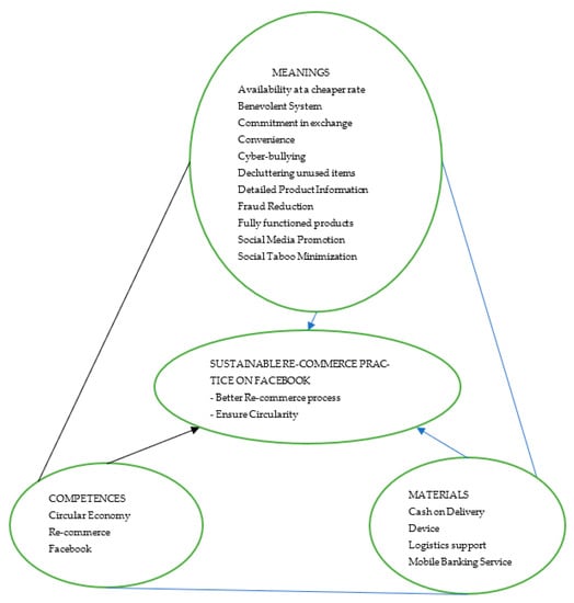 This study diagram was inspired by the work of Hess et al. [] (p. 186) about expected consumer behavior toward a consumption practice in a selected territory. The expectation of sustainable re-commerce practice is entirely dependent on the interconnectedness of meanings, materials, and competences. The positive practices of Facebook users are essential to ensuring better circularity in society.
