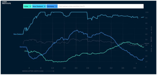 Research [57] considering a number of factors (geography, political systems, population size and economic development) to determine the impact of COVID-19 outcomes around the world suggests that, indeed, there is potential for cross-county learning when looking at Chile, New Zealand and Germany (Figure 2). Differences between those countries are certainly not explained by, e.g., geography (New Zealand’s remote island location) alone. However, the graphic is a representation of data available up to 13 March 2021 and does not include vaccination rates [57]. Higher values on the y-axis in Figure 2 indicate a better overall performance in managing the COVID-19 pandemic.