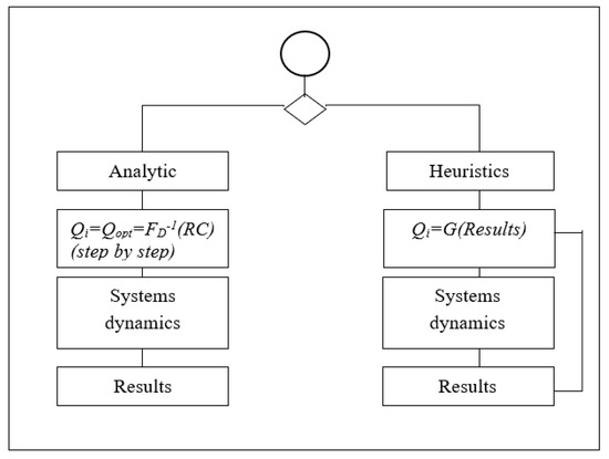 Qi is chosen according to the evolution of the system dynamic and the evaluation of the results that occur. In this decision-making framework, the following features play a decisive role for the individual: the economic framework of high or low profit, the information on the demand, and more generally, the confidence that the individual has on them, the perception of the duration of the game horizon and the motivation. Therefore, it appears that the analytic method must be chosen when the hypotheses for which Equation (1) is applicable are fully satisfied: fully known information on demand, fully known and fixed economic characteristics of the game, known and infinite game horizon. In all other cases, when the game horizon is or is considered to be short by the decision maker, when there is no information on the demand or when the incentive inspires the decision maker to be particularly risk-prone, the heuristic method should be chosen. Finally, it must be recognized that the heuristic method can be chosen when the existence of the algorithmic