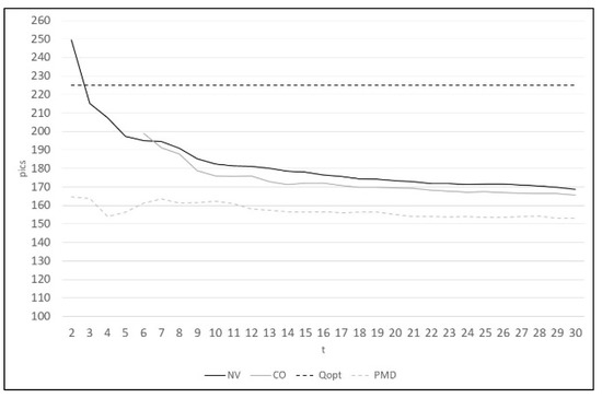 Qopt to be ordered in each period and, in the case of a sufficiently long operating horizon, the achievement of the expected profit; on the other hand, the choice of the heuristic method implies the assumption of a logic in which the quantity