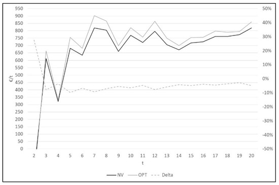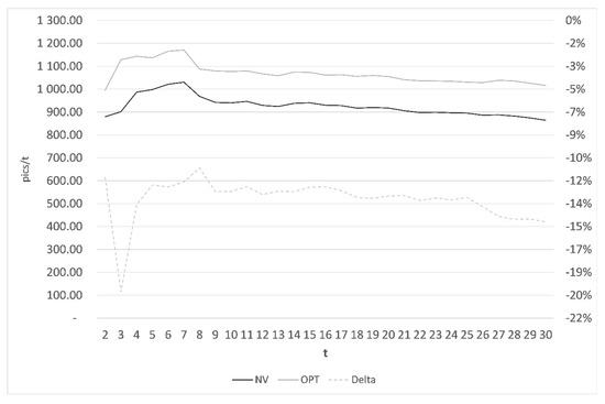 The critical ratio reflects the characteristics of the economic scenario: when it is greater than 0.5, it results in a high profit, otherwise, the low profit scenario emerges. Given Equation (1), the optimal profit can be achieved from the purchase of a greater quantity than the expected demand, Dm, and vice versa in the case of low profit. The heuristic method, on the other hand, requires the use of some strategy; it can involve a continuous variation of the ordered quantity as it occurs in the attempt of the decision maker to predict the demand at each sale period, for example.