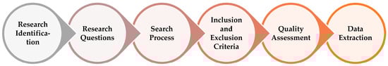 Initially, as illustrated in Figure 1, a comprehensive review protocol was followed, aiming at minimizing the likelihood of bias in the studies. This consists of research identification, identifying the SLR research questions, conducting the search process by identifying the databases and keywords, specifying the inclusion and exclusion criteria, applying the quality assessment, and extracting the data from the selected studies [31]. Identification of the research has been described in the previous section of this study, while the remaining stages are elucidated in the following subsections.