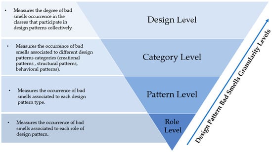 Navigating into a deeper insight of the objectives and characteristics of the selected studies, we applied the definitions of the four granularity levels of Mohammed and Elfish [40], and Alfadel et al. [17] for analyzing the occurrence of bad smells in design patterns. Figure 4 shows the definitions of the utilized DBGL in analyzing the studies with DBS occurrences (design level, category level, pattern level, and role level). Each selected study was assessed to identify if it was analyzing DBS occurrence in one or more levels of DBGL. We discovered that all 16 studies focused on the pattern level, out of which eight studies focused on the role level, four studies on the design level, and only two studies on the category level (see Table 6).