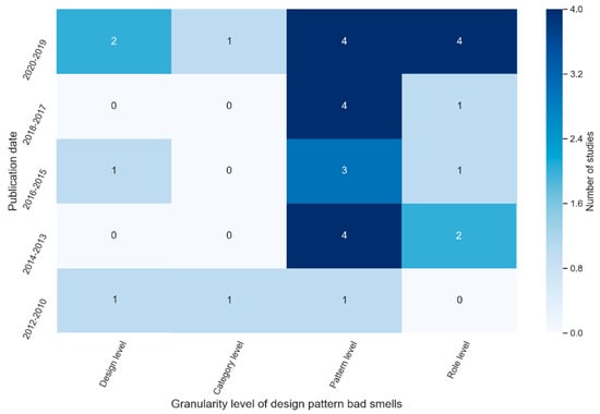 In the last decade, increasing attention has been paid by software developers and researchers to this phenomenon (e.g., [1,3,4,17]). Several studies have been published, aimed at identifying and addressing the bad smell occurrences (e.g., code smells or grime) in design patterns by establishing different solutions. For example, in 2019, Reimanis and Izurieta [1] proposed a conformance checking approach to detect grime occurrence in design patterns, whereas Sousa et al. [4] developed a design pattern smells tool using the association rule mining approach to detect code smell occurrences in GoF design patterns. Nonetheless, a very small number of studies were conducted with the aim of systematically reviewing the existing body of knowledge. For instance, in 2018, Bruno et al. [20] conducted a systematic mapping study to review code smell occurrences in GoF design patterns. Their review concerned three different elements: the co-occurrence phenomenon, the effect on software quality, and refactoring. They highlighted the main cases that contribute to the code smells co-occurrence phenomenon, such as the improper implementation of design patterns, further identifying the general trends and productivity of the research domain. However, although their review provides the software engineering community with very insightful information and views, it falls short when it comes to the occurrence of bad smells, such as grime and code smells, in GoF design patterns and in synthesizing their relationships with different granularity levels of analysis and different pattern types and categories.
