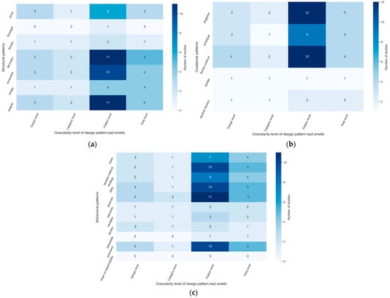 Additionally, to understand the objectives of the study in the DBS research domain, we developed heatmaps to discover the association between the studies’ objectives and the investigated design pattern types. As the GoF design patterns include 23 design pattern types, divided into three design pattern categories, we developed three heatmaps for each design pattern category, as illustrated in Figure 6.
