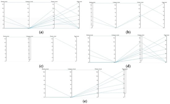 Distribution of grime occurrence studies among the four types of DBS granularity levels of analysis: (a) all grime occurrence studies; (b) grime studies scored high and medium in the design level of analysis; (c) grime studies scored high and medium in the category level of analysis; (d) grime studies scored high and medium in the pattern level of analysis; and (e) grime studies scored high and medium in the role level of analysis.
