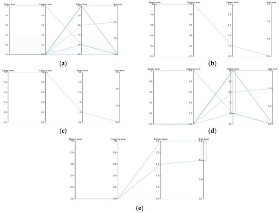 Figure 9b–d present the same distribution, limited to the code smells studies that gained high or medium score in the design, category, and pattern levels, respectively. We observed that only one study could obtain a score of more than 12 in the design, category, or pattern levels. However, Figure 9e shows various trends as the distributions are limited to the studies which achieved a score of 6 at the role level. More specifically, to analyze the parallel coordinates, we considered the studies which achieved a score of 1 or more than 1, as a medium and high score respectively. As illustrated in Figure 9b, 3 studies scored medium or high in design level, whereas at the pattern and role levels, studies 1, 9, and 6 earned high or medium scores (see Figure 9c–e). Particularly, of the three studies which earned a high or medium score at the design level, they also earned a high or medium score at the pattern and role levels.