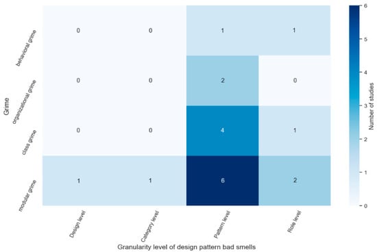 The research community either focused on detecting and investigating the code smell occurrences or grime occurrences in the GoF design pattern, considering different DBGL of analysis. Thus, nine studies (56.25%) emphasized code smell occurrences in the GoF design patterns, while seven studies (43.75%) emphasized grime occurrence in the GoF design patterns. In comparing the investigation of the two main categories in different DBGL, it showed that the highly emphasized granularity level is the pattern level (see Figure 7).