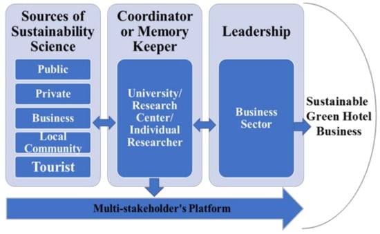 The enhanced roles of universities or individual researchers are very important to ensure the quality control and quality assurance of green practices. The green practices obtained from the multistakeholder’s platform also need updating and modification by universities or researchers to promote the leadership roles of green hotels for sustainable development (Figure 4). Therefore, the flow of sustainability science is very important for the capacity- and capability-building of the business sector to promote green business. Hence, the university plays vital coordinating roles for the smooth flow of science and technology to the business sector via the multistakeholder’s platform. With the support of the multistakeholders’ platform, the capacity and capability of the business sector will enhance the effective implementation of green practices because the QA and QC are ensured of the practices via the universities. The university can act as an effective coordinator to gather information about the compliance of these green practices in line with the national and international policies, seek financial support from various sources, and support the business sector with multilevel training and networking to promote green hotel businesses [82,83].