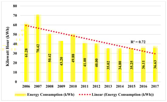Higher energy consumption was recorded in 2007 (70.42 kWh) and 2010 (49.88 kWh) due to the construction of new rooms, swimming pool, and gym, respectively (Figure 6). The average yearly energy consumption per room was steadily decreasing (R2 = 0.72) from 2006 to 2017. It was also found that Frangipani had reduced about 46% of total energy consumption in 2017 compared to 2006.