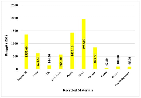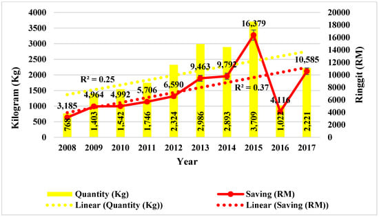 Frangipani has an annual saving target of about 10% in terms of reducing food purchases from outside because guest’s perception towards organic farming is more positive than towards genetically modified organisms [97]. Therefore, several vegetables, such as Papaya (Carica papaya), Spinach (Spinacia oleracea), etc., and fruits such as Banana (Musa spp), Jackfruit (Artocarpus heterophylla), etc., are being produced following the organic farming around the Frangipani resort. Thus, on average, about 2061.42 ± 937.57 kg of vegetables and fruits were produced per year from 2008 to 2017, and these vegetables and fruits production has saved about an average of 7577.21 ± 4003.29 RM per year during the same period (Figure 8). The organic vegetable and fruit production (R2 = 0.25), as well as the savings (R2 = 0.37) from the food production at the Frangipani, were increasing during 2008 to 2017; however, the reduced production in 2016 was due to erratic rainfall. Frangipani Langkawi Resort and Spa has a very good green practice of recycling materials. In 2017, the hotel saved about 7154.2 ± 670.41 RM from different types of recycled materials (Figure 9). Following the zero-waste concept, the hotel saved the following maximum amounts of recycled material (RM): recycled metal use, 1985.00 ± 97.90 RM; plastic use, 1425.10 ± 71.26 RM; recycled oil, 1352.60 ± 67.63 RM.