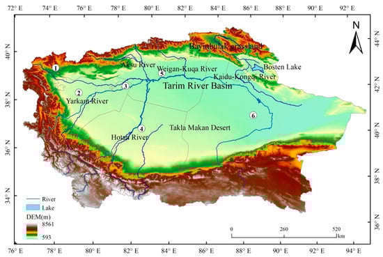 The Tarim River Basin, which is the largest inland river basin in China, is located in the southern part of Xinjiang (73°10′–94°05′ E, 34°55′–43°08′ N). The basin is fringed by the Tianshan Mountains to the north, the Kunlun Mountains to the south, and the Pamirs to the west (Figure 1). The region covers about 103 × 104 km2 and accounts for 61.82% of the total area of Xinjiang. Across this vast expanse, there are 114 rivers in 9 major river systems. However, despite the presence of so many water bodies, the basin still has the characteristics of an arid climate, which includes sparse precipitation, strong evaporation, and large temperature differences between day and night. More specifically, it has an extreme arid climate typical of the continental warm temperate zone, with an average annual temperature of 10.6 °C and average annual rainfall of 89.1 mm.