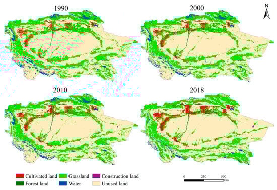 Largely due to the development of the One Belt and One Road initiative, land-use types in the Tarim River Basin significantly changed from 1990 to 2018 (Figure 2). Unused land constitutes the main land-use type in the basin, accounting for more than 64% of the total area. Concentrated in the middle and northeast of the study zone, unused land cover is mainly desert. Grass area is second only to unused land and is distributed in the west and north of the basin. Water bodies are distributed in the north and southwest, forestland is abundant only in the lower reaches of the Tarim River, and cultivated land is concentrated along the Kashgar, Yarkant, and Aksu Rivers, the Weigan–Kuqa River vicinity, and Bosten Lake. Lastly, construction land is sparsely distributed and exists only sporadically in cultivated land areas.