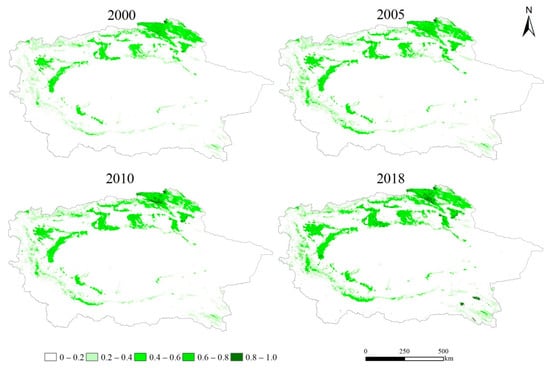 Low-value areas are primarily distributed in the southern portion of the study area (i.e., the southern part of the Taklimakan Desert). This area is primarily a desert zone, and the natural environment is unsuitable for vegetation growth. Areas classified as 0.8 < NDVI ≤ 1.0 are mostly concentrated in the northern part of the basin and exhibited an increasing trend, from 5.12 × 104 hm2 in 2000 to 26.56 × 104 hm2 in 2018, while areas with 0.6 < NDVI ≤ 0.8 are mostly distributed in the northern part of the study area, along with a few small pockets in the northwest and south. This type of area is mainly at mid-elevation and features good vegetation growth conditions. Although the overall area of this region showed a rising trend from 2000 to 2018, increasing by 44.71 × 104 hm2, it is easily affected by human activities.