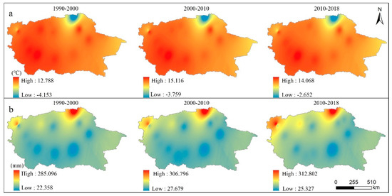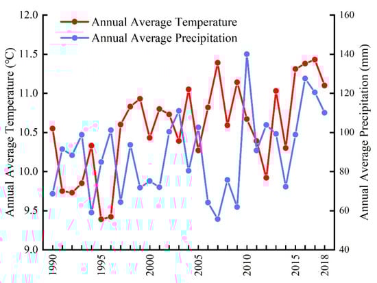 From 1990 to 2018, annual average precipitation in the Tarim River Basin was 89.10 mm, the annual extreme maximum was 140.03 mm, and the minimum was 55.66 mm, giving a range of 84.37 mm. From 2005 to 2010, precipitation was at a low level. The extremely heavy rainfall that had occurred in July 2010 caused precipitation in the study area to break through the historical extreme value for the same period. Since that time, precipitation in the study area has continued to be extreme. However, this changed in 2014 to an overall increasing trend (Figure 6). Temperature also worked together with precipitation to affect regional land-use types. From 1990 to 2018, high-temperature areas were mainly concentrated in the southwestern part of the Taklimakan Desert and the Tarim Basin. Temperature in the Bayinbulak grassland, south of the Tianshan Mountains in the northernmost part of the study area, was generally low throughout the year. However, the temperature then increased, which accelerated the loss of soil water and led to the death of vegetation and a spike in desertification. This reduced the vegetation coverage. On the other hand, the increase in temperature contributed to light and heat resources that were more suitable for the growth of crops. Encouraged by local governments and driven by national policies, there was a subsequent rapid expansion of the area of arable land in the region.