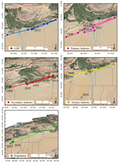 Analyzing the trajectory of the GDP center-of-gravity migration in the study area shows that the center-of-gravity migration of GDP presented a shift from the southwest to the northeast, mainly in the direction of Aksu (Figure 7). Longitudinally, the GDP moved 1.20° to the east, while latitudinally it wandered 0.26° to the north. The direction of GDP migration followed the same path as that of cultivated land and population. From 1990 to 2018, the trajectory of GDP migration changed twice, and the overall trajectory moved toward rapid economic development. This development is mostly concentrated in the northern part of the study area, with a migration distance of 418.88 km and a migration rate of 14.44 km/a.