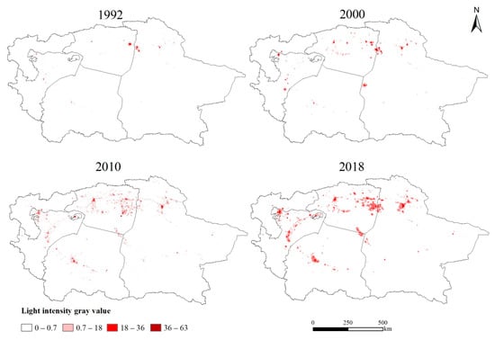 The brightness of lights at night does more than just guide a plane to an airport: lights can reflect the degree of urban development and changes, monitor the progress of urbanization, and reflect urban expansion [33,34]. Figure 7 shows that the brightness of lights in the Tarim River Basin continued to increase from 1992 to 2018, with the lighted area showing a rising trend from 0.3% in 1992 to 6.4% in 2018. The Kashgar, Hotan, and Korla regions formed the center of the light expansion. The fastest growth rate occurred during 2010–2018 when the scope of expansion was also the largest. Data show that the brightness of the lights in 2018 increased to 1.5 times the brightness of the lights in 2010, indicating that the urbanization process of the study area developed rapidly during this time frame.