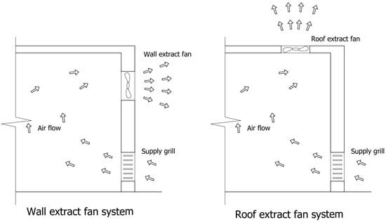 Several types of forced ventilation systems are used to improve the air quality and temperature in industrial buildings, and this research study focuses on two main types of ventilation: extract ventilation and spot cooling. While the former system is based on a natural supply via trickle vents or mechanical extraction, the latter can reduce exposure to pollutants in building spaces []. Notably, extract ventilation systems work by depressurizing a structure, namely the system exhausting air from the space, which in turn causes a change in pressure that pulls in the make-up from the outside via leaks in the building shell and intentional, passive vents. Indeed, exhaust ventilation systems are relatively simple and inexpensive to install [], with a typical exhaust ventilation system consisting of fans connected to a centrally located exhaust point []. Furthermore, adjustable, passive vents through windows or walls can be installed in other rooms to introduce fresh air, thus leaks in the building’s envelope do not have to be relied upon. However, passive vents may require larger pressure differences than those induced by the ventilation fan to work properly. Notably, one concern of exhaust ventilation systems is that, along with fresh air, they may draw in pollutants, which can include radon and molds from crawlspaces, dust from the attic, fumes from the attached garage, and flue gases from the fireplace, fossil-fuel-fired water heater, or furnace [].