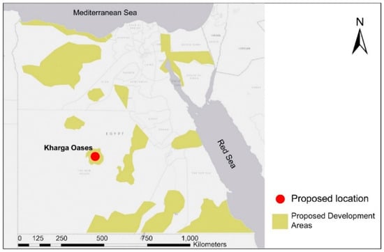 This research study discusses a comparison between the ventilation efficiency of an oil plant consisting of a number of machines operating at a capacity of 100 watts per cubic meter and located in Kharga Oases in the Western Desert of Egypt. The area’s climate is arid, with sporadic rainfall and hot temperatures during the summer months []. The temperature occasionally approaches 50 °C and the mean monthly relative humidity ranges from 30% during the summer to 56% during the winter []. Kharga Oases is included in the Egyptian state development plan to increase the inhabited and agricultural area, as shown in Figure 3.