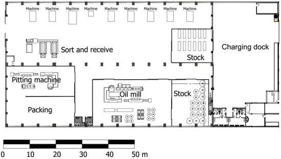 The case study factory building occupies a built area of 5000 m2 and includes an industrial space with different workspaces and storage areas. In addition, there is a loading area and an administration building attached to the factory, as shown in Figure 4.