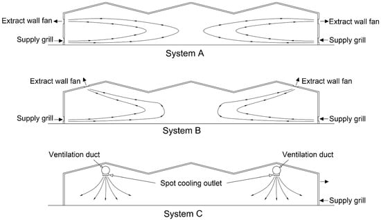 Meanwhile, the second system (System B: roof fan extract ventilation) relies on the installation of extraction fans in the ceiling, which can improve the distribution of the air inside the space by simulating natural ventilation. Furthermore, natural air supply grills are installed at the height of 0.5 m from the factory floor, with the sizes and numbers shown in Table 1 and Figure 1 indicating the installation method for the ventilation elements, as well as the expected ventilation distribution through the adopted system. The specification of the grills and fans are the same as the first system.