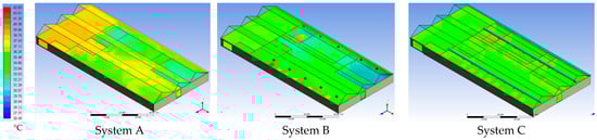 According to the CFD simulations for the three systems, the temperature disruption and airflow velocity have been conducted to compare these systems and identify the most suitable system for the provision of a suitable work environment and for the reduction of energy consumption. Notably, the temperature disruption in the space for different systems has been conducted using the CFD model, as shown in Figure 6 and Figure 7, with the temperature volume rendered in the former revealing that for systems A and B, there was a variation in the temperature between the parts of the working area. Although some areas had a low temperature, there were other areas that recorded a high temperature. According to System C, the temperature volume rendering the homogeneity in the temperature had fairly good records over the entire factory area. Figure 7 shows the temperature contour plan for the levels 0.4 m and 2 m, ensuring the observation in temperature volume rendering.