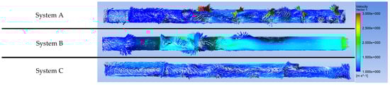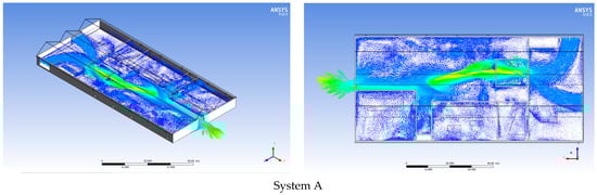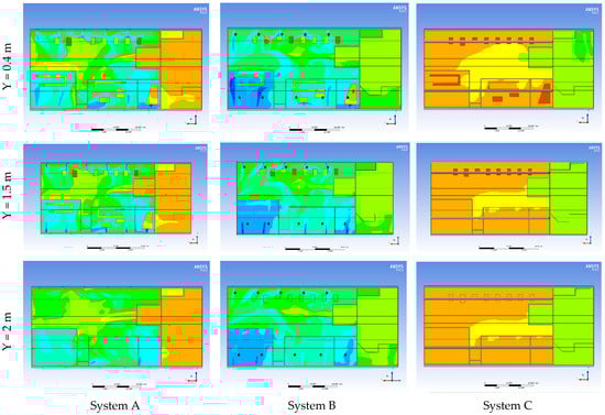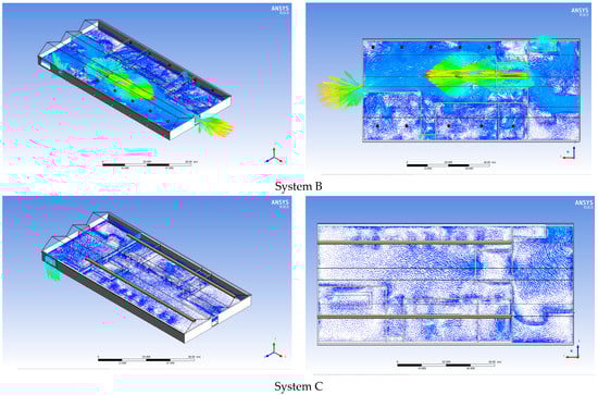 Furthermore, Figure 8 and Figure 9 show the airflow velocity distribution in the factory space, with that in the former showing the air velocity distribution for Systems A and B as possessing a wide range variety, in turn causing a high velocity in some areas and low velocity in others. Meanwhile, System C shows a uniform distribution of air velocity over the entire factory space. These observations are also ensured in the ventilation velocity cross-section in Figure 9.