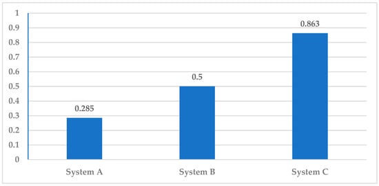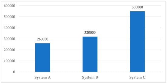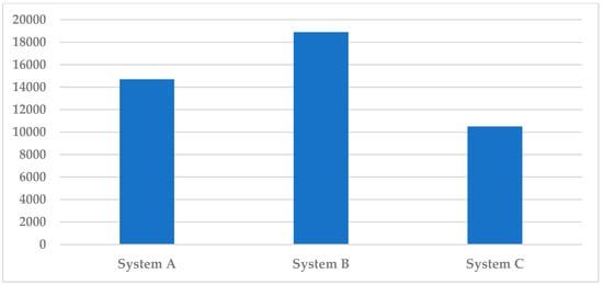 The ventilation effectiveness factor comparison for the three systems (Figure 10) reveals that the most effective ventilation system is System C, which represents the spot cooling system. Furthermore, an economic comparison has been conducted between the three systems, as shown in Figure 11 and Figure 12, with the former illustrating the initial cost for the different systems. This reveals that the most expensive system is C, while the cheapest is System A, which explains the preference of most investors to use System A in factories. Meanwhile, Figure 12 shows the annual energy consumption costs for the different systems, revealing that the most energy-saving system is System C. The energy consumption cost was conducted by estimating that the kWh costs EGP 1.15 for business use according to [].