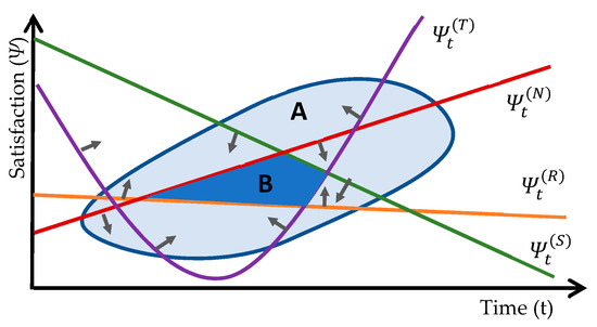 As shown in Table 3 in Section 3.1, each consumer assigns a different value to each resource according to its characteristics and personal preferences; consequently, the quantitative value for Ψ was different for each type of resource and consumer. For example, was greater than or , showing that Alpha preferred natural resources to social ones. For Beta, was greater than or , showing that Beta preferred social resources to natural ones.