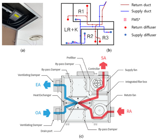 (a) Flow metering system (*FMS) and supply diffuser; (b) duct plan diagram; (c) heat recovery ventilator.