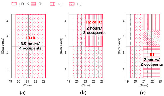 The maximum number of occupants was analyzed as four for LR + K and two for R1, R2, and R3, as shown in Figure 4.
