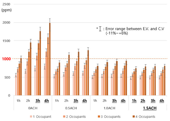 Figure 5 shows the increase in CO2 concentration in LR + K depending on the number of occupants and ventilation frequency, and the error ranges considering the experimental values are also expressed. The analysis results that considered these error ranges were as follows: