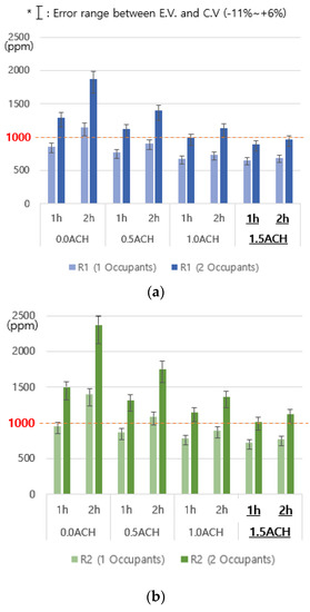 As a result of the experimental case analyses, R1, 2, and 3 showed CO2 concentrations exceeding 1000 ppm even with the highest ventilation case, 1.0 ACH. Accordingly, CO2 concentrations in the 1.5 ACH cases were additionally analyzed according to the formula, and the possible error ranges were indicated. In addition, the calculation results that expanded the analysis range considering the maximum residence time and maximum number of occupants are shown in Figure 5 and Figure 6 with the possible error ranges.