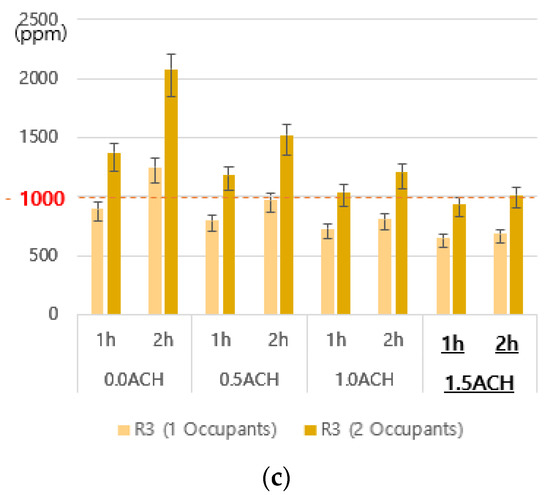 - When a 1.5 ACH ventilation was performed, CO2 concentration could be maintained at a level lower than 1000 ppm in R1, R2, and R3, even if one occupant stayed for more than 2 h. However, the CO2 concentrations in R1, R2, and R3 exceeded 1000 ppm and reached 1130, 1361, and 1206 ppm, respectively, if two occupants stayed for 2 h.