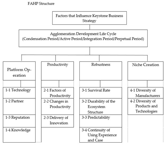 Each case of manufacturing cluster was analyzed based on the type of clustering, the development stage of clustering, and the degree of application of keystone strategies. Figure 1 shows the architecture of the FAHP mode for assessing the factors that impact keystone-type business strategies (Table 3 and Table 4).