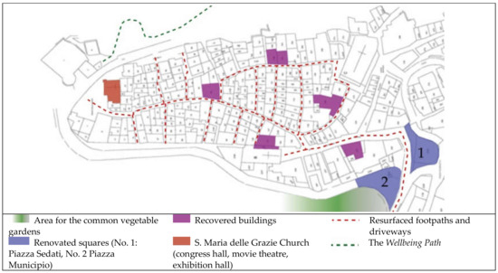 This is the context in which the Riccia’s Well-being Village project was set, whose tourist and residential purposes pay particular attention to protecting the health care of senior citizens. Financed by €1,142,644 from national Funds for Development and Cohesion (29%) and European Funds for Regional Development (71%), the investment includes the actions listed in Table 2 (documents of Riccia Municipality, Italy). Figure 1 shows the location of the interventions aimed at recovering and valorising the Riccia village.
