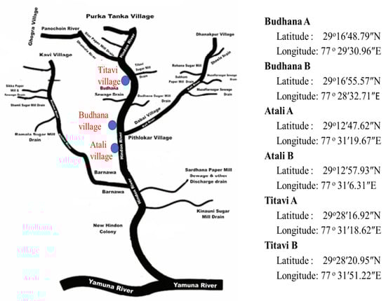 The present study was conducted along a natural river, the Hindon River near the Muzaffarnagar district of Uttar Pradesh, India. The Hindon River flows through industrial clusters and the highly populated rural communities of western Uttar Pradesh. In addition, the Hindon River passes under a bridge and the town of Budhana. The studied area was the village of Tatavi, the town of Bhudhana, and the village of Atali in the Muzaffarnagar region (Figure 1). These sites are situated along the river.