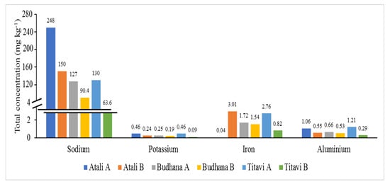 Figure 2 demonstrates the spatial distribution pattern of the major elements. The order of the examined of major elements was as follows: Na > Fe > Al > K. The concentrations of Na in the sediment ranged from 63.6 to 248 mg kg−1. The sediment from Atali contained the highest Na concentration (248 and 150 mg kg−1, respectively), whereas the lowest Na concentration was observed at Titavi (130 and 63.6 mg kg−1, respectively). The higher Na level at Atali (particularly at Atali A) could be explained by the higher amount of suspended solids carried by the river water, as this site is very close to the Hindon River bed. Similar to our findings, Khan et al. [29] recorded higher major elements near the river site. It is likely that the sediment from Atali contained the highest Al concentrations (1.06 and 0.55 mg kg−1, respectively), whereas the lowest Na concentration was observed at Budhana (0.66 and 0.53 mg kg−1, respectively). These elements largely represent the clay mineral content in the sediments as well as in the feldspar, amphiboles, and pyroxenes [30]. The higher Na level at the Atali A site could be explained by higher amount of suspended solids being carried by river water, as this site is close to the bed of the Hindon River. Similar to our findings, Khan et al. [29] recorded higher amounts of major elements such as Al and K near the river site, but the values were comparatively higher than the present findings (7.28 to 11.65% and 6.31 to 7.99%, respectively. In addition to this, the recorded Al level is much lower than the permissible limit, 10,000–300,000 mg kg−1.