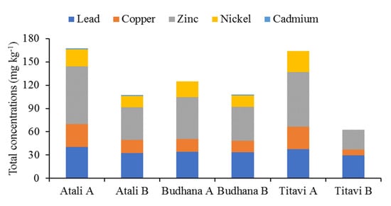 The average Pb value in the sediment sample was recorded as 40.6 mg kg−1 at Atali A, 32.5 mg kg−1 at Atali B, 33.9 mg kg−1 at Budhana A, 33.7 mg kg−1 at Budhana B, 37.7 mg kg−1 at Titavi A, and 29.8 mg kg−1 at Titavi B. The Zn level was found above the permissible limits of the USEPA, TRV, and ASV [22]. This high Pb level might be due to industrial effluents, sewage outfall, and other local factories. However, anthropogenic inputs such as lead-based automobiles and antifouling paints were thought to be the prime sources [29]. The consistently higher Pb levels in the current study compared to those of Ni and Cu is because of soluble Fe–Mn oxide fraction, which is due to the precipitation of industrial, agricultural, and domestic sewage and the higher sedimental retention of soluble oxides [29]. In fact, these effluents bring more suspended solids along with clay and silt, which allows for more Pb absorption the from water, which accumulates in the bottom sediment due to the higher sedimentation rate, and hence, higher Pb values were recorded [23]. Higher Pb levels pose threat to fishery resources. In plants, (beyond 5 mg kg−1) it causes severe growth retardation, discoloration, and morphological abnormalities, which cause adverse effects on aquatic biota [34,36,37]. The highest Cu values was recorded at Atali A (29.2 mg kg−1) and Titavi A (28.8 mg kg−1), and these values much higher than the IRS standard (28 mg kg−1). However, the observed Cu values were below the USEPA, WRS and ASV permissible limits, but the values were well above the TRV value [22]. Cu is very dangerous to invertebrates, fishes, and aquatic plants, even in minimal amounts, and is more dangerous than other heavy metals, with the exception of mercury. In particular, compared to terrestrial plants, the Cu was absorbed three times more by aquatic plants [38]. Therefore, higher Cu values cause damage to cell membrane integrity and restrain root development [34]. The observed Ni level was well below the standard value set by the IRS (37 mg kg−1). However, the Ni level (22.7 mg kg−1) was well above the standard TRV value, i.e., 16 mg kg−1 [39]. According to the TRV value, all of the sites were quite polluted, which might cause toxic effects to aquatic plants and biota. This finding suggests an anthropogenic contribution in the form of effluents [29]. It is likely that cadmium is also highly toxic to aquatic biota, and sewage sludge, mine wastes, metallurgical industries, and municipal effluents were thought to be the prime sources of Cd [29]. A relatively high concentration of Cd was recorded at all of the sampling sites. The observed Cd level was exceeded the USEPA, ASV and TRV standards, which indicates that it has great potential to cause toxicity to aquatic species [22,34].