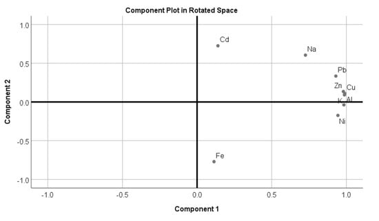 Metals detected in the sediment samples of the Hindon River showed different correlation levels with each other (Table 2). Pb showed a very high positive relation with Cu, Zn, Al, K, and Na. A study of correlations also depicted that Cu displayed high relation with Pb, Zn, Al, and K, while Zn was highlight correlated with Al Pb, Cu, and K. Ni was only highly correlated with only Al. Al was highly related with Cu, Pb, Zn, Ni, and K, while Na was only highly correlated with Pb. The K also showed a higher correlation with Zn, Pb, Cu, and Al. Na showed positive correlations with all of the studied elements except for Fe. Na was detected in higher quantities than all of the other metals, which indicates that Na acts as regulating factor for optimal microbial activities in sediment and in the distribution of other metals [33]. Generally, a high correlation between two heavy metals indicates that they come from similar pollution sources or that they share analogous transformation and migration processes [33]. Accordingly, a good high correlation in this study was found between the Pb, Zn, Cu, Al, and K metal pairs, indicating that common anthropogenic sources with mutual dependence on metal level in Hindon River and similar geochemical characteristics. Similar to our findings, Singh et al. [22] recorded a positive correlation among the studied heavy metals from the sediment of the Ghaghara River, India. In addition to this, Suresh et al. [40] demonstrated that a higher relation between metals indicated a common origin of the studied metals with mutual dependence and similar behavior. On the other hand, a weak relationship among heavy metal pairs indicates that metal distribution is controlled by geochemical incidences rather than by any single element. Additionally, PCA analysis was performed to identify the metal contamination source. The Kaiser–Meyer–Olkin (KMO) value was found to be 0.982 (i.e., KMO > 0.5). The PCA results generated two PCs with eigenvalues greater than 1 and a cumulative variance of 87.38% (Table 3). The PCA (Component 1) results showed strong positive loadings for almost all of the metals except Cd and Fe (Figure 4). Component 2 showed strong positive loading for Fe and Ni (Figure 4). The strong loading for almost all of the metals indicate similar contamination sources, particularly discharge from untreated domestic, industrial, and agricultural sewage [18,25]. The metal levels in the Hindon River sediment determined that the river is moderately to severely polluted, and this has been verified by PCA. PCA depicted that the moderate to severe pollution in Hindon river basin is due to the direct discharge from untreated domestic, industrial, and agricultural sewage from surrounding areas [18].