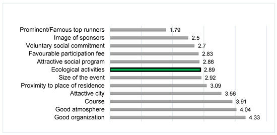 As the mentioned values lead us to believe, the influence of ecological measures on the positive assessment of a marathon can only be considered average. Figure 1 shows that, particularly, factors that directly influence the event experience of the participants (including travel to and from the event) ranked higher, such as proximity to the runners’ place of residence (3.09), the attractiveness of the city (3.56), the attractiveness of the course (3.91), a great atmosphere during the event (4.04) and good organization (4.33). This means that for a majority of the survey participants, ecological measures are of some relevance in their evaluation of a marathon event, but the listed core features proved considerably more important in their assessments. Nevertheless, ecological measures were evaluated much better than the feature that ranked last, which was the participation of famous or elite runners in the race (1.79) even though event organizers are frequently willing to pay large sums for signing prominent participants or for offering attractive prize money. Other important factors, such as favorable participation fees (2.83), attractive social programs (2.86) or event size (2.92) were rated very similarly to ecological activities.