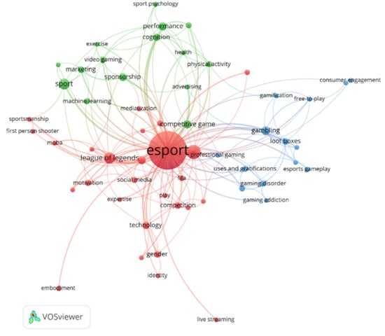 To identify the emerging themes related to eSports in 260 studies, co-occurrence analysis of the keywords was conducted using VOSviewer. This technique applies a text-mining algorithm to the titles, abstracts, and keywords of articles to construct maps of the keywords [40,63]. The links between keywords were established based on the co-occurrence of keywords in the selected articles. To avoid repeated keywords, a customized VOSviewer thesaurus file was used to merge variants with the same meaning (e.g., “esport”, “esports”, “electronic sport”, and “e-sport”). From a total of 806 keywords, the co-occurrence analysis identified 56 keywords with a minimum of three co-occurrences. Table 6 presents the frequently co-occurring keywords in eSports research. In Figure 2, the nodes indicate the frequently occurring keywords, and the links indicate the relationships between themes. Moreover, the nodes closely connect to each other to form a theme with the same color [61]. VOSviewer identified three clusters consisting of nodes with the same color: (1) eSports games (red), (2) development of eSports (green), and (3) eSports user perception and behavior (blue). Specifically, the first cluster (red) included the characteristics of eSports games and activities close to eSports (e.g., [2,66,67]). The second cluster (green) consisted of comparisons between eSports and traditional sports (i.e., physical activity) and marketing opportunities in eSports (e.g., [13,66]). Finally, the last cluster (blue) captured different perceptive and behavioral aspects of users within the context of eSports, such as competitive behavior, gaming addiction, gaming disorders, gambling, and consumer engagement (e.g., [67,68]).