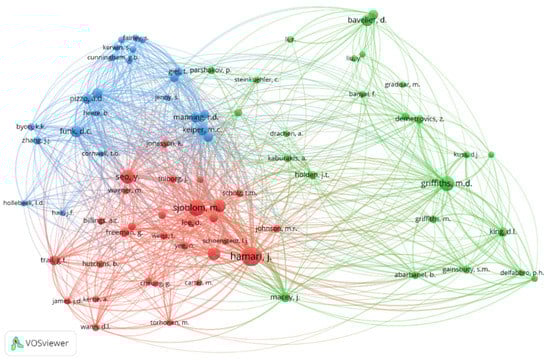 As a next step, to explore the most cited authors in the field of eSports research, a co-citation analysis was conducted on a sample of 15,309 authors cited in our 260 publications. A list of 75 authors was extracted with a minimum of 25 citations. As portrayed in Figure 4, the co-citation analysis on cited authors generated a map of 75 authors consisting of three clusters. The top three cited authors were Hamari, J. (207 citations), Griffiths, M. D. (147 citations), and Sjöblom, M. (145 citations). More specifically, the first cluster (red) primarily consisted of authors from the fields of gaming and video games (e.g., Freeman, G., Hamari, J., Sjöblom, M., Taylor, T. L., and Witkowski, E.) and digital consumption (e.g., Seo, Y.), indicating that the publications of these authors have been extensively co-cited by other studies.