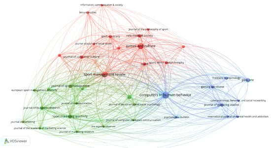 Finally, the third cluster (blue) basically contained journals that emphasize behavior research (e.g., Computers in Human Behavior, Cyberpsychology, Behavior, and Social Network), gambling and addiction (e.g., the Journal of Behavioral Addictions, the Journal of Mental Health and Addiction, Review, and the Journal of Gambling Studies), and psychology (Psychology Bulletin and Frontier in Psychology). The cluster indicated that these journals are interested in behavior-related studies in the context of eSports.