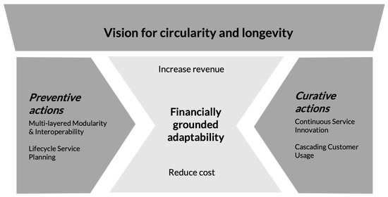 If we consider products in CBMs from a temporal perspective, possibilities to avert premature product obsolescence not only occur during the product’s design phase but also throughout the product’s lifecycle. Here, Rose [48] distinguishes between two approaches: preventative and curative actions. Building on this work, two fundamental approaches to addressing future uncertainties in products are identified in this paper:
